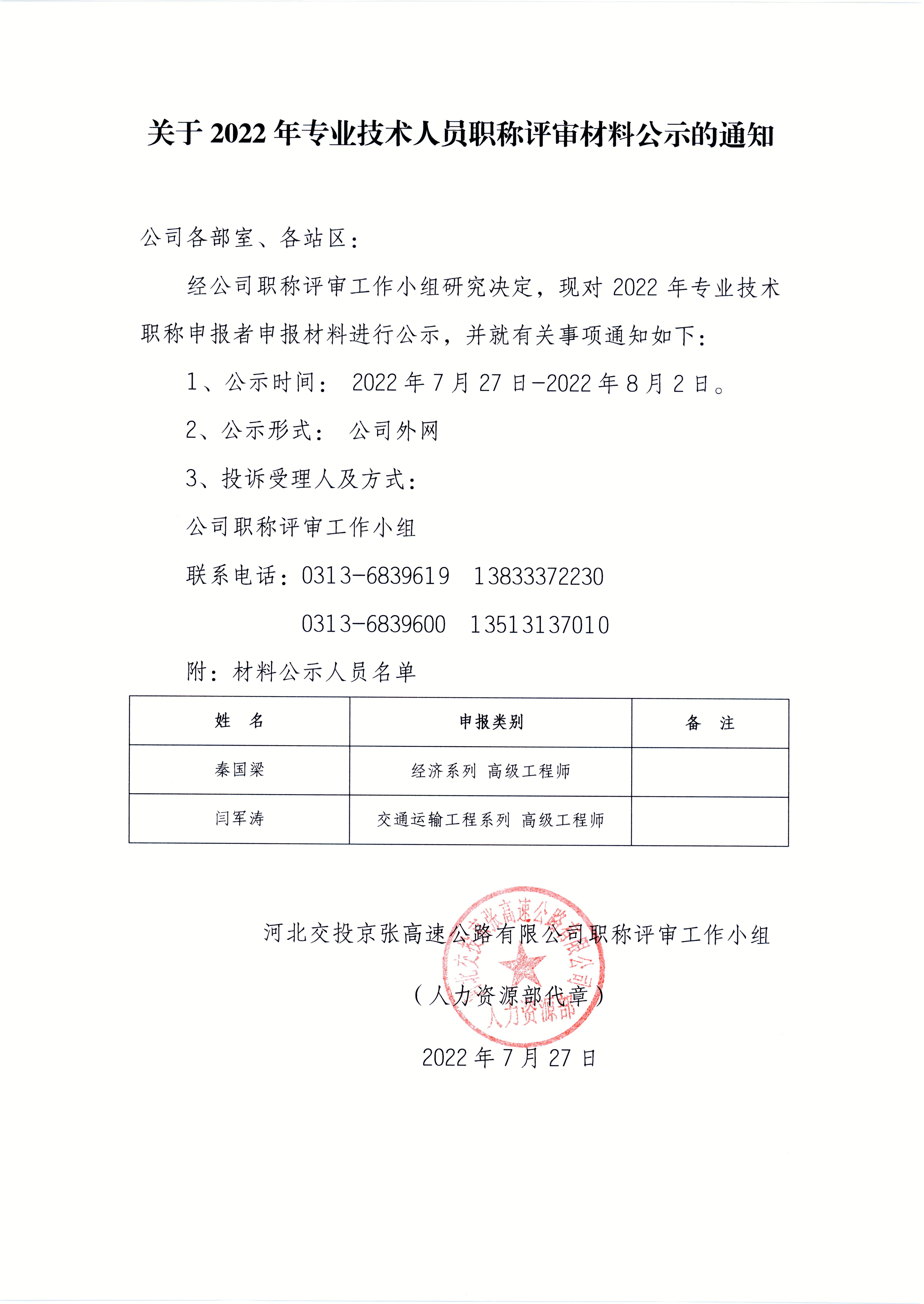 關(guān)于2022年專業(yè)技術(shù)人員職稱申報(bào)材料公示的通知